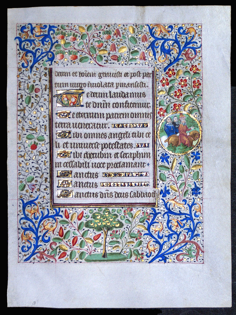 The inhabited initial “T” begins the Te Deum (Canticle of Sts. Ambrose & Augustine): “Te Deum…” (O God, we praise Thee: we acknowledge Thee to be the Lord. Everlasting Father, all the earth doth worship Thee. To Thee all the Angels, the Heavens and all the Powers, all the Cherubim and Seraphim, unceasingly proclaim: Holy, Holy, Holy, Lord God of Hosts! Heaven and earth are full of the Majesty of Thy glory. The glorious choir of the Apostles, the wonderful company of Prophets, the white-robed army of Martyrs, praise Thee. Holy Church throughout the world doth acknowledge Thee: the Father of infinite Majesty...).