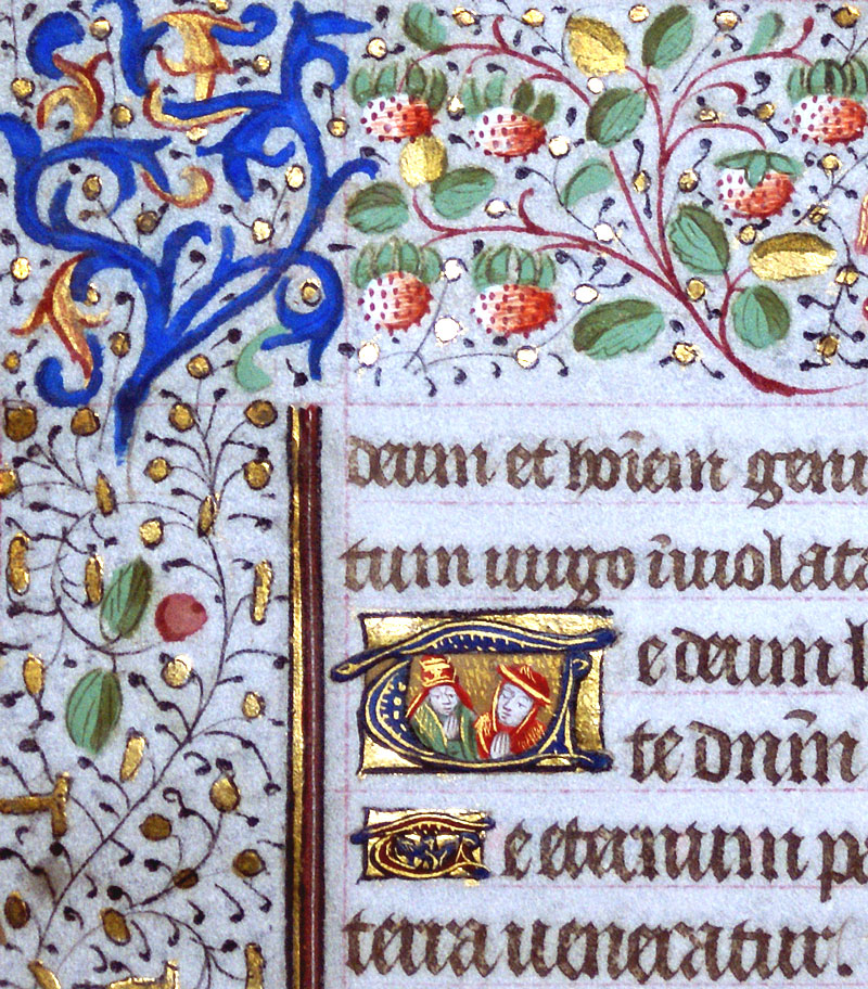 Full illuminated borders of dense liquid gold with pink & blue acanthus sprays interspersed with ivy leaves having gold dots decorated with pen strokes, & with flowers, strawberries (symbol of perfect righteousness) and leaves executed in pink, red, blue, green, & gold with a tree bearing golden fruit in the lower margin!
