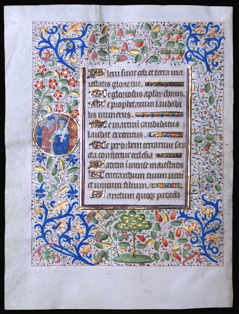 One two-line initial inhabited with two portraits; 14 illuminated one-line initials in red, blue & gold, & ILLUMINATED ROUNDELS HISTORIATED WITH SCENES OF THE LIFE OF ST. ALEXIS. The book from which this leaf came was likely a commission for a specific person of high rank, since it was very specific & very costly.